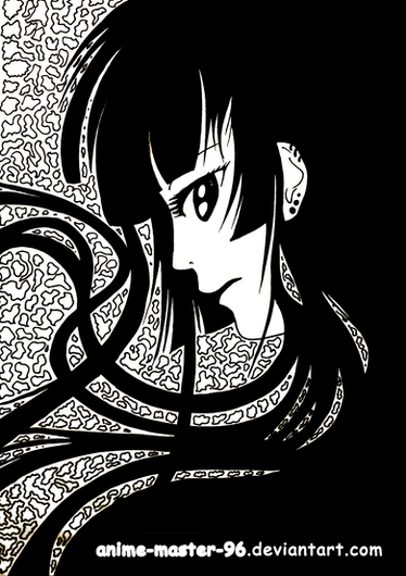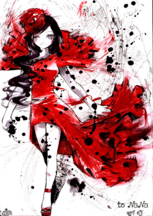 i love the outstretched hair. and the addition of the red petals. i am so a fan of black and a touch of red. i'm inlove with jesabelle. T_T.