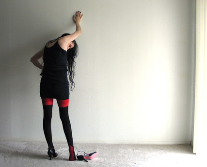 those are really cute socks! but for helpful critique, I think it wouldve been better if they shoes were a different color, or you didnt add the black socks, so you see the style of shoes you are wearing, instead of them just blending into the same color of the socks. its a cute picture, and I love how it mirrors the drawing.