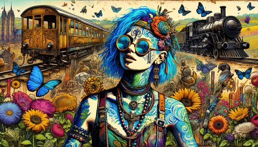 Bathed in the ethereal glow of a setting sun that never truly sets, this embodiment of futuristic fantasy stands amidst the silhouette of a city surrendered to time. Her eyes, shielded by circular goggles, reflect a world not seen but imagined, a realm where the mechanical and mystical intertwine. Wires spring from her scalp like wild, untamed thoughts, each strand pulsating with the lifeblood of a thousand neon dreams. Her skin is a canvas of soldered poetry, circuits running like rivers of silver thought. The chaotic beauty of her existence is framed by a skyline that tells tales of yesteryear's splendor, now whispered amongst the wind and echoes of a dystopian world. Here, in this moment suspended between the digital and the divine, she is both the observer and the observed, a solitary figure finding solace in the synthesized heartbeat of her own creation.