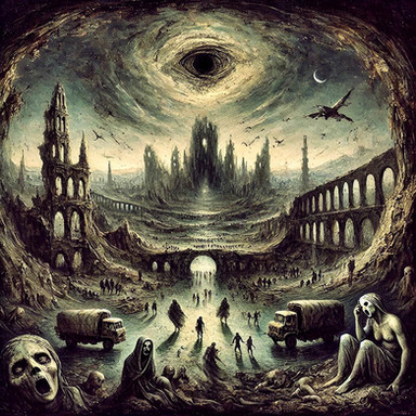 A desolate, dystopian landscape unfolds under a tumultuous sky. Dark purples and crimson swirl among the clouds, casting an ominous light on the skeletal figures below. These beings, with elongated limbs and ghostly presence, are caught in an obscure ritual amidst the ruins. Towering structures that mimic skeletons and ruins pierce the horizon, hinting at a once-great civilization now succumbing to decay and the passage of time. The entire scene is a haunting reminder of impermanence, painted in a palette that underscores the gloomy and oppressive atmosphere of a world teetering on the edge of oblivion.