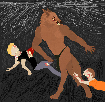 In this pic, the dude in the back is Dimitri, the dead one is Audrey, and the werewolf eating/disemboweling Audrey is her old friend, Chelsea, who got turned into a werewolf.