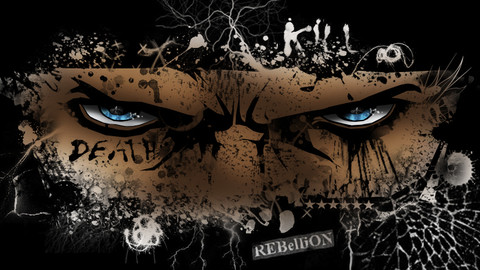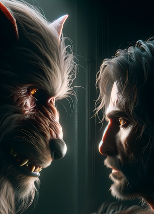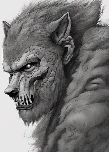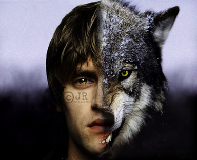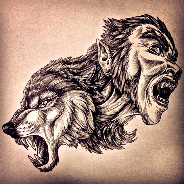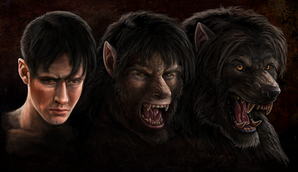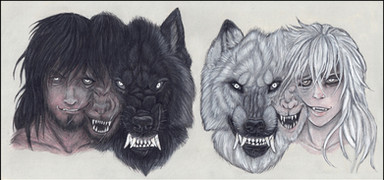 Really dig the way you did this. Maintaining that grin throughout the transformation, and the symmetry of the mid-way mark combining both of the eyes. The stain that one could reasonably assume could be blood mostly over his human side; Perhaps to say that his human side is dying being slain by his feral half. Despite his fangs as a wolf, the vibe that he gives off is less hungry and more of a "Oh look, a toy!" or "You think you've bested me hmmm?". The middle stage feels as though his face is growing downward and not so much outward, to me at least, maybe that is intended. The way his eyes are solid white in the wolf form could mean that he is blind to all else but his instinct, which plays really nicely in to the theme of werewolves indeed.