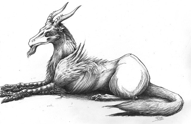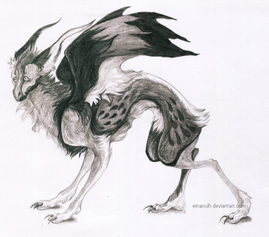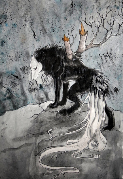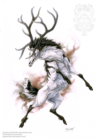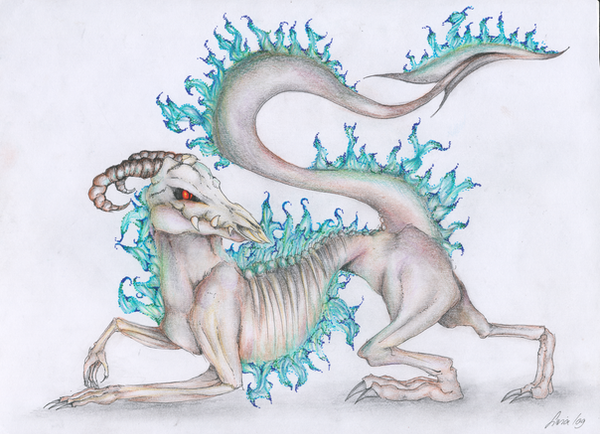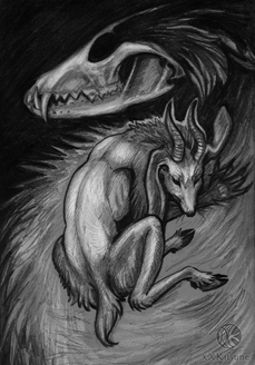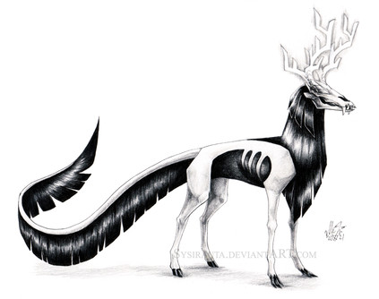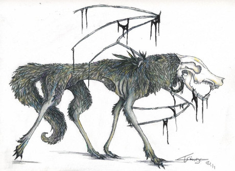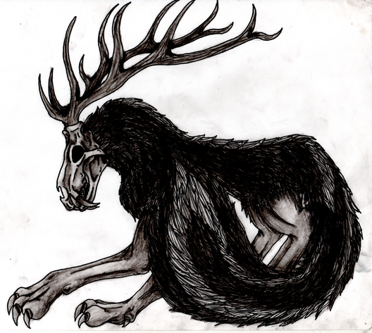 Of course I altered him some, like I didn't give him his usual long neck and dragon-like anatomy, though his body is longer here than normal canines, and his tail is really long, but a little more like a dog's than his normal tail. I also made his skull a deer's, since I was in the mood to draw a deer skull