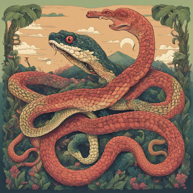 AI has a very magical way of identifying and representing Snakes. Snakes and Snake coils can often be represented as halos, as seen embedded in this image by Midjourney. This is because of the circular geometry associated with the curvature of a Snake and the mathematical image recognition algorithm and process. They are very difficult to draw, even for a human artist, and often AI can create these serendipitous errors and artifacts that look like optical illusions and halos made of Snake coils.Wolf and Snake are sssame animal!!!