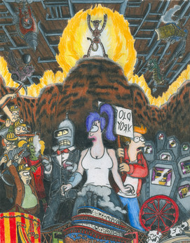 This drawing had an odd start. Away back in May I had a chance to have a face to face meeting with Tim, who runs the site “The Futurama Madhouse”. www.futurama-madhouse.net/ BTW, if my bribes are current he has been known to occasionally feature my drawings.