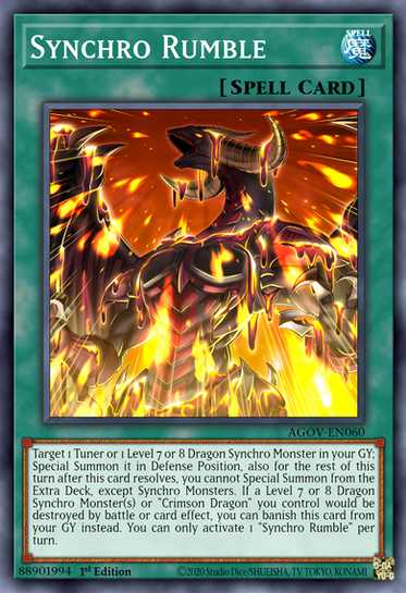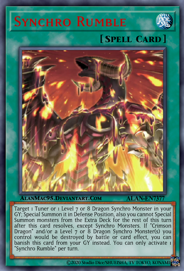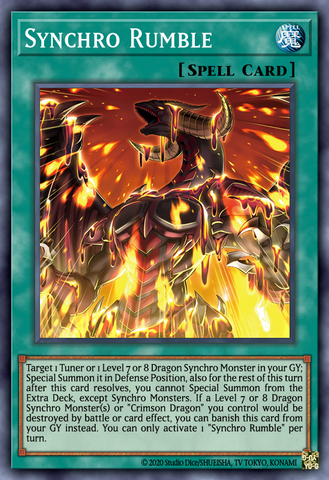 Target 1 Tuner or 1 Level 7 or 8 Dragon Synchro Monster in your GY; Special Summon it in Defense Position, also you cannot Special Summon monsters from the Extra Deck for the rest of this turn after this card resolves, except Synchro Monsters. If "Crimson Dragon" and/or a Level 7 or 8 Dragon Synchro Monster(s) you control would be destroyed by battle or card effect, you can banish this card from your GY instead. You can only use activate 1 "Synchro Rumble" per turn.yugipedia.com/wiki/Synchro_Rum…