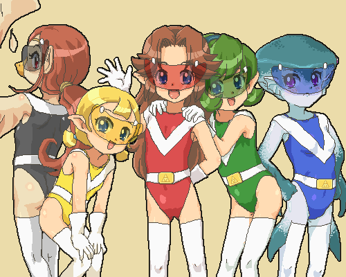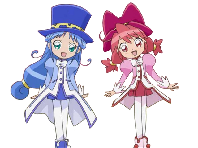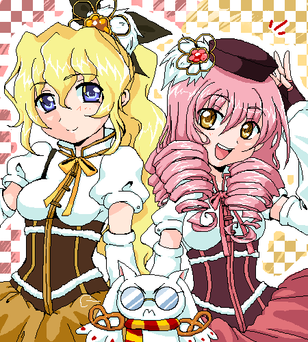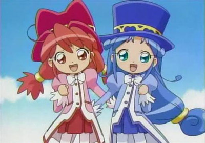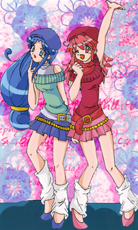 Fine, Rein, and Poomo in a huge food processor. Fine(a red-haired girl) and Rein(a blue-haired girl) are twin princesses, the protagonists of Fushigiboshi no Futagohime, the fantasy magical girl anime series. Poomo is their magical-servant.When the audience rating of this program was not good, I contributed this pic on Futaba-channel, a huge oekaki BBS in Japan, as the joke. As a result, I got big anger from many normal fans. (On the other hand, sick fans demanded me to draw "the processed version".)