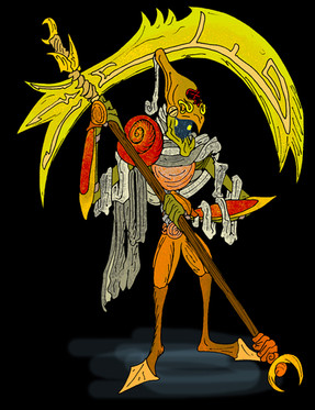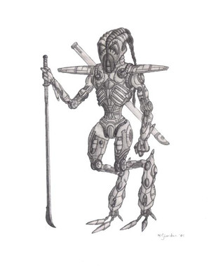 On dirait vraiment un bonhomme allumette dénué d'intelligence recouvert de métal. Si tu voulait le faire menaçant tu a manqué ton coup. Le coté technique du dessin est très bon!