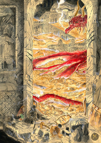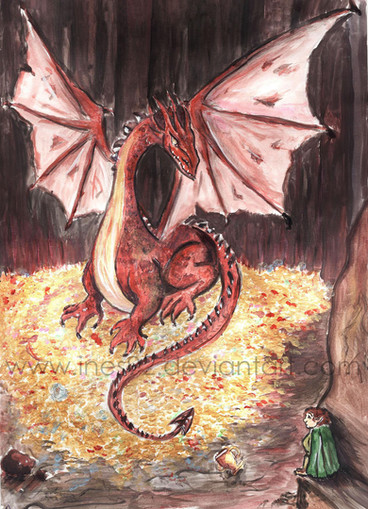 "Smaug certainly looked fast asleep, almost dead and dark, with scarcely a snore more than a whiff of unseen steam, when Bilbo peeped once more from the entrance. He was just about to step out onto the floor when he caught a sudden thin and piecing ray of red from under the drooping lid of Smaug's left eye. He was only pretending to sleep! He was watching the tunnel entrance! Hurriedly Bilbo stepped back and blessed the luck of his ring. Then Smaug spoke..."