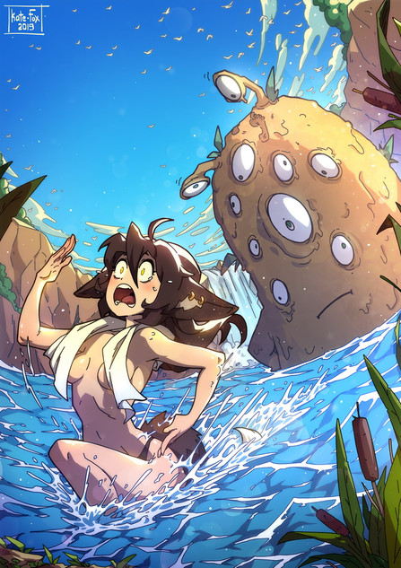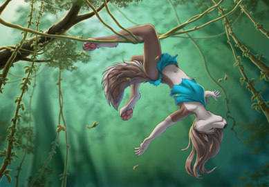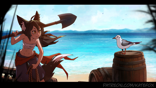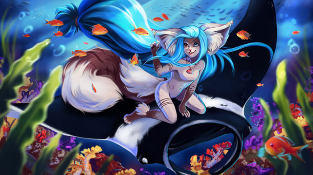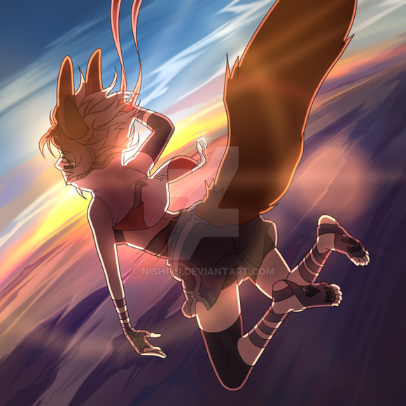 Great collaboration pic here. The way it all came together is really stunning. The flying stingrays is an interesting touch, which really shares the impression and visual feel as though you were floating. The freefalling pose of the foxgirl also came out great. Overall, there is adventure in the air. Very well done. ^^