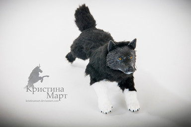 The wolf is made from faux fur, soft to the touch. Stuffed with synthetic padding.The head is joined to the body using the skeleton, it is possible to rotate and tilt. Legs are attached with cotter pins, whereby spinning. Also the legs are reinforced with a skeleton, they can be bent.