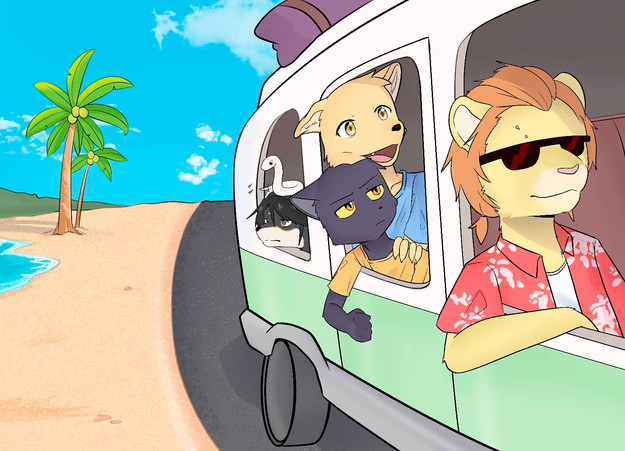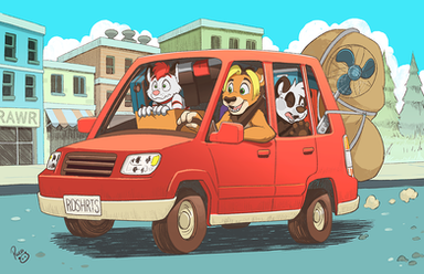 #anthro #bird #bunny #car #digital #digitalart #female #furry #highway #male #parrot #rabbit #road #tour #van #bear #cat