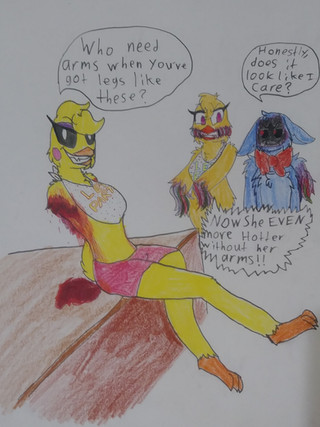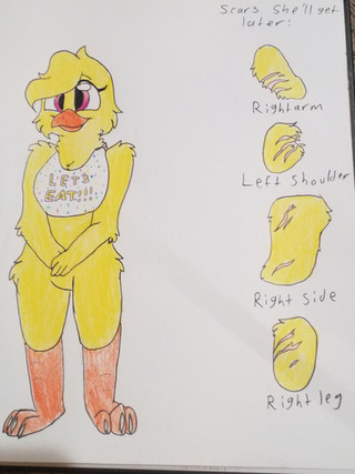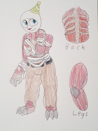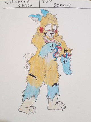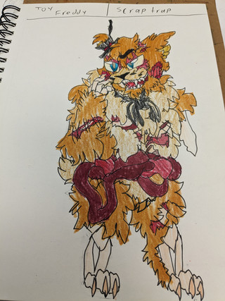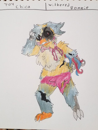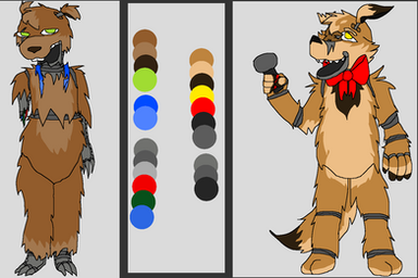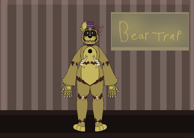 Springtrap is a dirty green-yellow Tom Rabbit Animatronic with some darker green tinted fur here and there, the same color for his legs. He has many gashes that expose his bones and intestines, a torn ear, yellowish eyes with teal iris, and he has a decomposing human body inside of him. Springtrap is Golden Freddy’s twin brother, but he’s the younger brother because Golden Freddy was born first, and both he and Golden Freddy were named Fredbear and Springbonnie. When both Springbonnie and Fredbear were thirteen, they noticed their mother had a bit of a sadder personality, even though she was a very cheerful and happy Rabbit Animatronic, but something made her a sadder character. So both of the brothers tried their best to cheer their mother up, and it worked, but she still felt sad about that thing once in a while. When Springbonnie and Fredbear were fourteen and a half, their father was able to help them get a job at a restaurant called Slender’s Dinner. They both liked working there, and everything was going great, until four years later, a horrible accident happened. One of the other workers, Funtime Foxy, got in an accident with a young girl that ended with her killing that girl. And the next day, most of the other workers were attacked, and everyone blamed that they did that to themselves and that Funtime Foxy killed that girl on purpose. They were not happy that they were being blamed for all this, so they all left, and no one saw any of them in years. The restaurant was then given to both Fredbear and Springbonnie, and it got changed into Fredbear’s dinner. At first, the brothers didn’t really know what to do since they were technaily the new owners of the restaurant, but they eventually got the hang of it. When both Springbonnie and Fredbear were roughly twenty-three, it was a normal day, but something wasn’t right. Both Springbonnie and Fredbear noticed this man carrying a strange bag that is mostly seen in gimbs. They didn’t think much of it at the time, and they carry on with their routine. Later that day, something happened to Fredbear, he felt like something poked the back of his neck, and he started to act a bit off. Springbonnie noticed this, and he asked if everything was alright, Fredbear said he was fine, but something told Springbonnie that something wasn’t right, so he kept a close eye on his brother. Just minutes after Fredbear started to act weird, his and Springbonnie’s manager, Willam Afton, told them they had to go on stage, but when Springbonnie tried to tell him that Fredbear wasn’t feeling like himself, Afton then snapped at them and told them to go out there anyways. As they were on stage, Springbonnie noticed that Fredbear started to make small growling noises, he once again asked him if he was alright, but this time, Fredbear only nodded his head, but he kept on making growling noises. As Fredbear was making growling noises, nearly all of the children in the restaurant that day came rushing to the stage, and there was this one little boy who had a Fredbear plushie and he was forced to the front. Just moments after the mother of that boy came rushing over to him because it turns out the four older kids behind him were actually keeping him there, Fredbear made a deep growl, and in a blink of an eye, he attacked that little boy, biting deep into his head. When he yanked back his head, everyone started to scream and run away, Springbonnie was horrified to see what his brother did, and right before Fredbear attacked Springbonnie, other employees hold him back, eventually, Springbonnie also grabbed hold of his brother, trying to calm him down. A few minutes of struggling to keep Fredbear still, the authorities arrived, and Fredbear was finally calming down, and when they were at the police station, Fredbear was doing nothing but apologizing to everyone for what he did. Springbonnie knew his brother would never do something like that, and he knew something wasn’t right, so he went back to the restaurant to see if he could find anything that would make Fredbear act like that. After looking around for a while, Springbonnie bumped into the mother of the child that Fredbear attacked, andSPringbonnie tried his best not to bring up her son, but he slipped up for a moment, but the mother forgave him for bringing it up. After helping that mother look for her son’s toy, Springbonnie carried on with his search. After looking around for a while, Springbonnie found the bag that strange man was carrying. Springbonnie then looked in it for a moment, and all he could find was a small empty glass bottle and what looked like a syringe. Springbonnie thought it was strange that that man would carry around two small objects in a big gimb bag or the fact that man was carrying something in that bottle and syringe. Springbonnie then looked around for that man, but he was nowhere, it was almost like he disappeared. Right before Springbonnie gave up, he noticed the door to the back storage was open. He went over to close it, but right before he did, she smelled something in the room that let out a horrible smell. Springbonnie didn’t think much, so he went inside, switched the lights on, and was horrified to find four children and that same woman he met earlier dead on the floor. Someone had brought them to that room and killed them. Springbonnie was frozen for a moment, he couldn’t move, and when he finally took a step back, he felt something hit the back of his head, and he fell to the ground unconscious. When Springbonnie woke up, he was surrounded by paramedics and police officers. He was confused and scared, but when they got him out of the room, he found out that everyone was blaming him for the murders in the storage room. Springbonnie then tried to explain what happened, but he couldn’t remember what happened clearly, and not only that, it turned out who really done it was wearing gloves and he place then murder weapon in Springbonnie’s hands when he