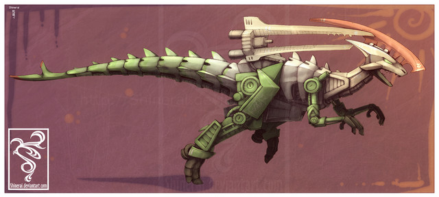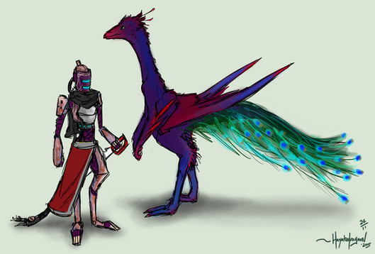 Nifty! Mecha-things are super cool :-D I like his head-feathers, and the little hint of blue in the background just pulls everything together.