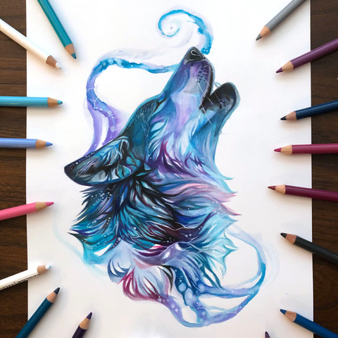 This is the centerpiece of a triptych for an amazing client! This full body wolf is 11x17 inches in watercolor and colored pencil with Pearlescent touches. I had a blast tying in the teals, blues and purples of the two companion howling wolves that will flank this larger wolf!Related content