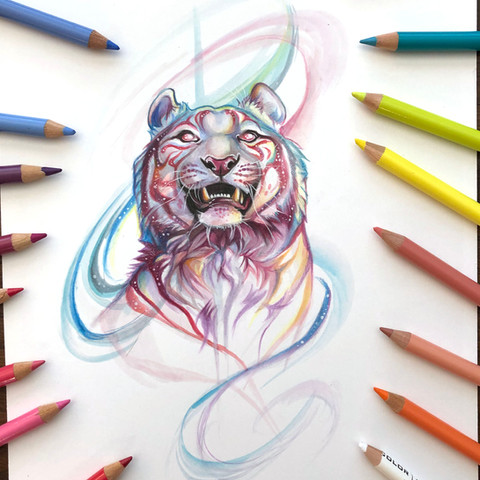 It is almost exclusively colored pencil. There is a little watercolor underneath on the tiger's face and neck.