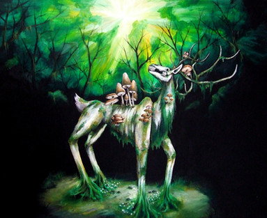 Visually speaking, I imagine a whole heard of these deer creatures playing host to healthy city-like growths. At a certain point the growths take over and the relationship stops being one of balance and turns to that of a parasitic relationship. Maybe the growths can survive on their own for a certain time after the death of the deer, but at a certain point they too will whither and die away without the deer as a host organism.