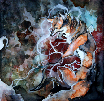 I like the message in this piece,Β remind me Steppenwolf novel by Hermann Hesse. Colors flows fromΒ completeΒ darknessΒ to very bright right side, that with wolfΒ figureΒ symbolizeΒ to me escaping to freedom. Though red strings hold wolf back in the city,Β causingΒ him to suffer. Wolf is painted in dark colors - same as the city so, that gives me feeling that he is part of it. This is exactly what man in the bookΒ struggleΒ with. Great work!!! That would be perfect cover for the book. Β Β Β Β