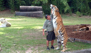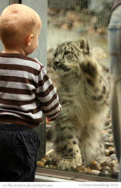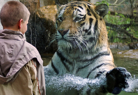 This picture is so adorable! The size difference between the little boy and the tiger really helps you realize how gigantic tigers really are. I also love how it looks like the tiger is about to give the boy a high five .