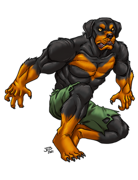 There isn't many tougher breeds of dogs than Rotts and the design of his suit was dictated by the natural pattern on the dog's. My thought was he was a home-made hero in that he made it all himself from things you can buy or get.