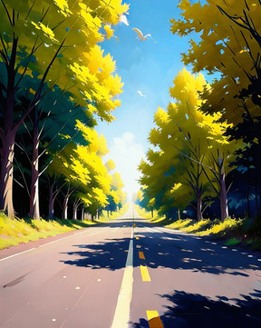 “In the heart of a bustling metropolis, an enchanting secret unfolded—the Golden Path. Hidden amidst towering skyscrapers, this mystical road meandered through the city, flanked by verdant grass and trees ablaze with yellow and orange leaves.
