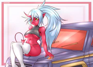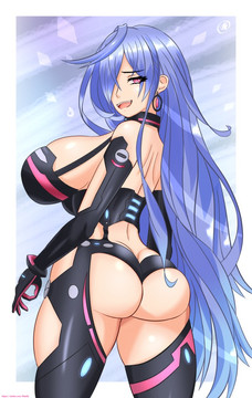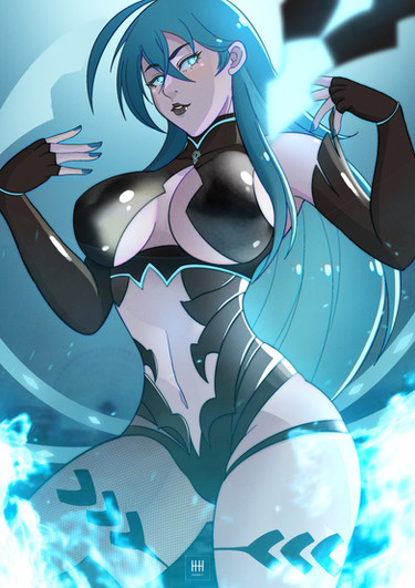 It's a pretty stock standard pose made somewhat better by the nice shading and color work. The character herself is alright. Again nothing really new, but there's a nice contrast between the blue hair and the red eyes. The outfit is... somewhat interesting. In the sense that I can't remember the last time I saw spandex warn OVER bandages for no apparent reason. So style points on the thighs.