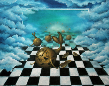 Ok, this painting is huge. I've spent sooo many hours on it. It's a painting I did for art class. It has a lot of symbollism and stuff. Let me explain:First off, as you can see, they are in fact, flying bird cages. Ironic, no? To the left you can see a storm coming (moving to the right), so that's why all the bird cages are flying away from it (with the exception of the top right one, which is tring to come to a hulting stop, and the one that has no clue where it's going because it's covered up). Every object inside the cages represents something in a regular bird cage, but enlarged. So, the food is represented by sunflower seeds. Then the water is up top, the little stink the bird sits on is the giant tree, and the little tinker bells the bird plays with is the huge church bells in the top right. The cage closest (the angry bird) is the pet bird itself enlarged (into a hawk). Everything is cartoony in this painting (the style), on purpose (because you would never see flying cages in real life, lol). This whole piece is ironic because you'd think the bird and the rest would be free, because they are flying, but they really aren't because they are locked up in cages.