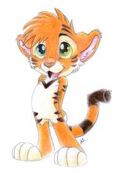 Aieee! Could this be the cutest little tiger ever?! Kay. I'm just lost for words, everytime you try a new animal, or a new idea, you always come up with the best possible outcome =3 Your work is really special I like how you drew the tiger's firm muscles and face... The eyes are multicoloured and nice~ The anatomy looks okay to me! That's a strange bg pattern though, it looks really exotic ^^ Are you going to expand on that? Anyway, great work!