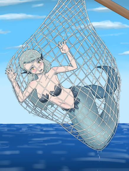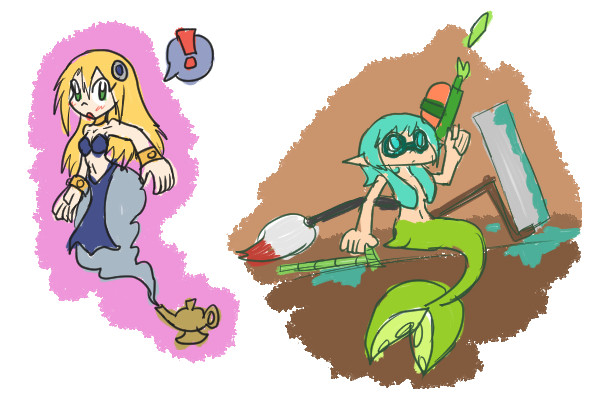Prize for KazeSolarFlareA cell shaded drawing of Fuyuki, as a merinkling , being caught by Callie, dressed as a pirate, as she stares seductively at her.