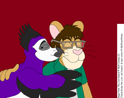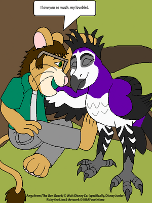 Made with DeviantArt muroAlthough not voted for by the majority, it is voted for by Spike-McFinn ( ). with me, Ricky the Lion (as a teenager) getting my hair ruffled by Anga, the replacement Keenest of Sight of the titular heroic animal knights from The Lion Guard. I am sitting criss-cross applesauce in front of a rock, and Anga perches her feet on that rock to stand behind me and run her beak through it (upward, so as not to cut my head).
