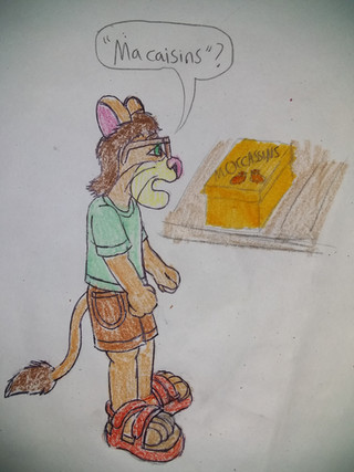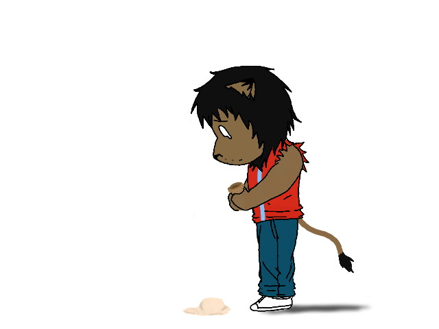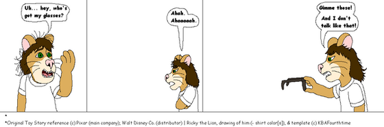 Based off an idea I had.In it, here is me, Ricky the Lion, just getting my school lunch tray. On the menu are... veggie lasagna, garlic bread, salad (with lettuce, carrots, and ranch dressing), apple slices, and milk (chocolate milk for me). However, someone has tied both my shoelaces together so one lace per shoe was in a hard knot, causing me to trip and spill the food from the tray before I can even get to the table.