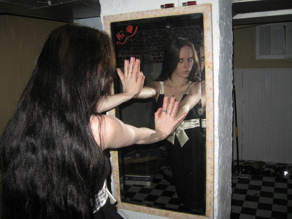 Bathroom: it looks like she's in a bathroom