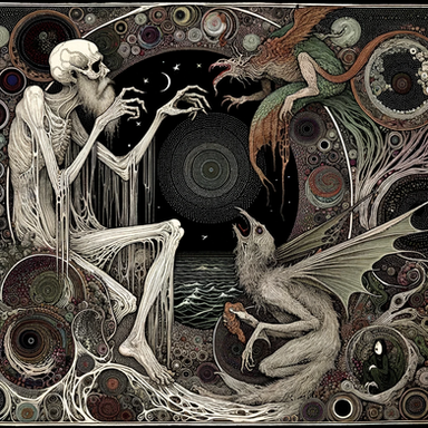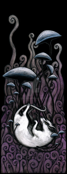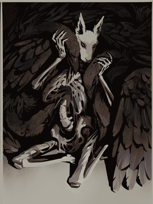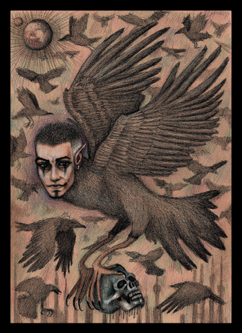 I used to have dreams of a eight winged skeletal raven man riding an eyeless unicorn. He referred to himself as "Death Himself", and he was such a powerful image that I crafted him into a tarot card.24x36 Scratchboard and Watercolor.