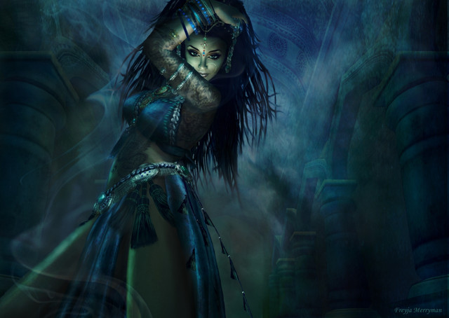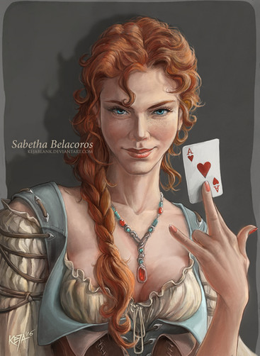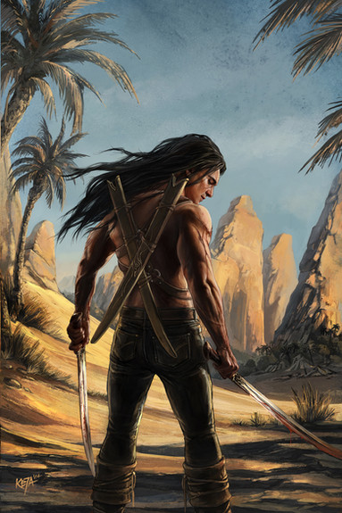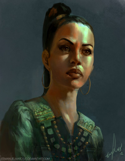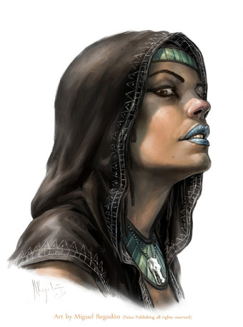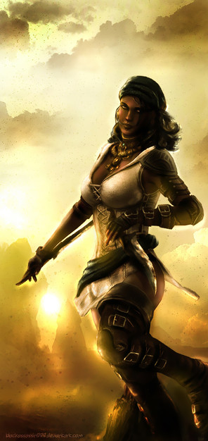 I love this piece. It's not often one sees a black woman sensibly dressed in the world of fantasy art, and the cunning in her expression, the creativity of her outfit, and the gravitas of her surroundings are all perfect.