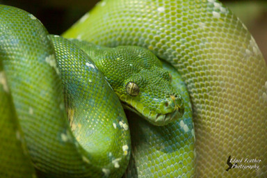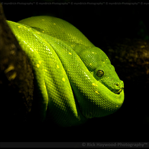 Category: Reptiles & AmphibiansA beautiful Green Tree Python (Morelia viridis) coiled up in its favourite position at the Copenhagen Zoo. Unfortunately, it had chosen a rather dark corner to rest in, so I had to use the built-in flash for this shot.
