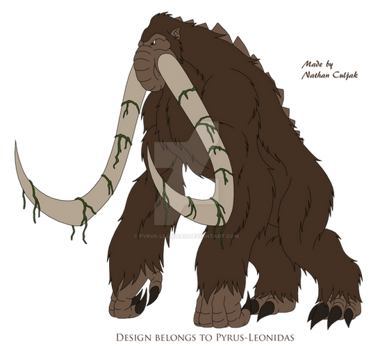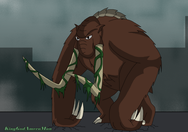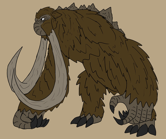 Appearance: Behemoth is very similar to the ground sloth of prehistoric times, with a short trunk and sharp claws on his hands and feet. Two massive tusks curve out of his mouth like a mammoth's, and he has a row of short triangular plates on his back.