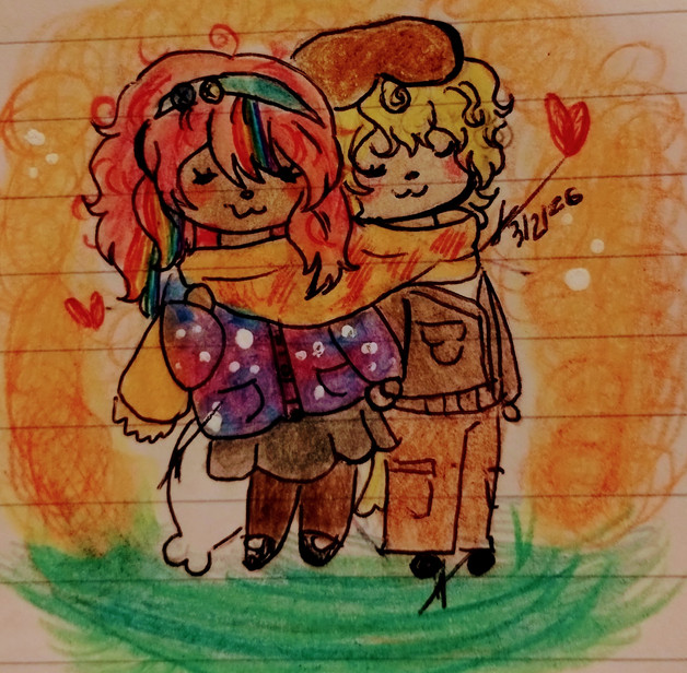 The real struggle here was the background. Besides not knowing how to draw things like trees and architecture very well, perspective was a huge problem. The only thing I know is to make things further away smaller and darker. The question is how much smaller? Also since this is like a close up shot. I couldn't visualize what part of the scene would be cut off. It probably would've helped to draw the background first then the characters...