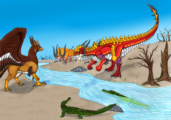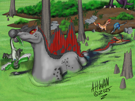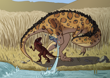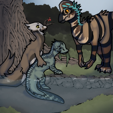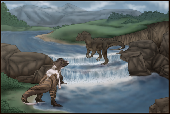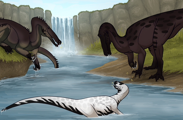 A long overdue request for Fyn16 , a scene from their LBT story "To Tread Upon Fields Afar." I got stuck in a rut with environment painting and had to work myself out of it x.xThe characters are Fyn and Zaura the Amargasauruses and Sol the Suchomimus.Β