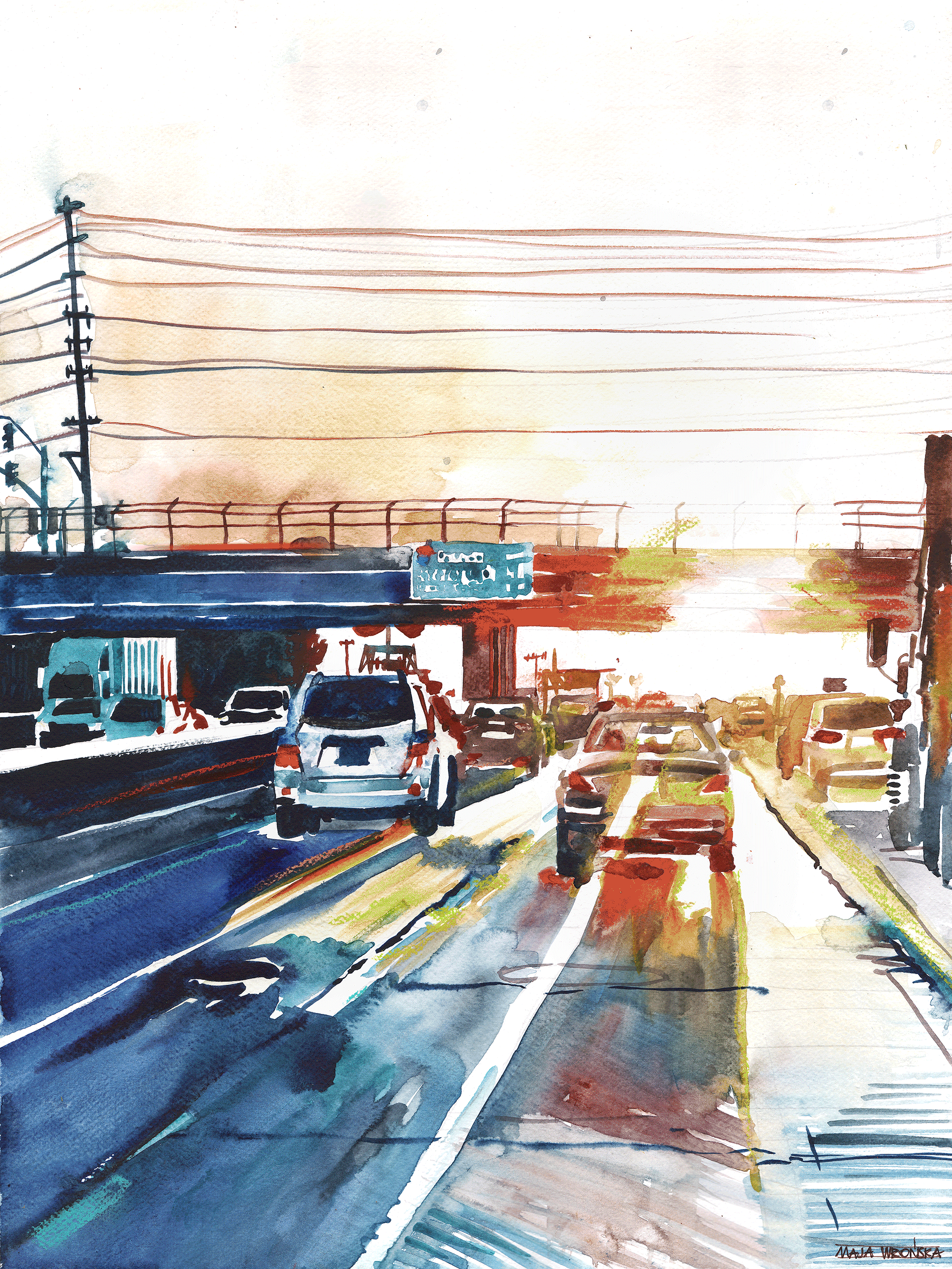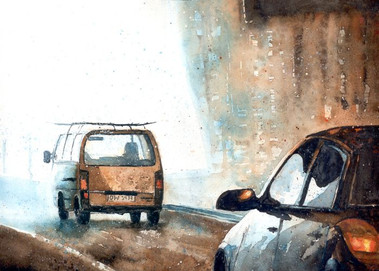 Good perspective makes the viewer look in to the painting. I like the sketchy quality to the houses on either side