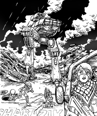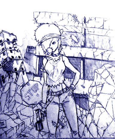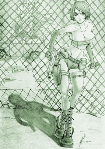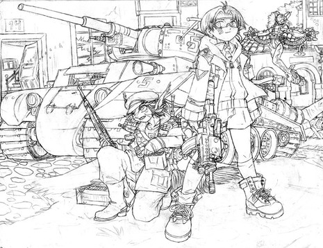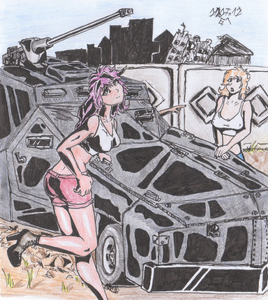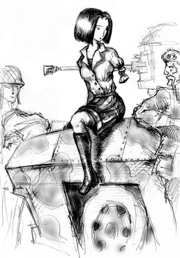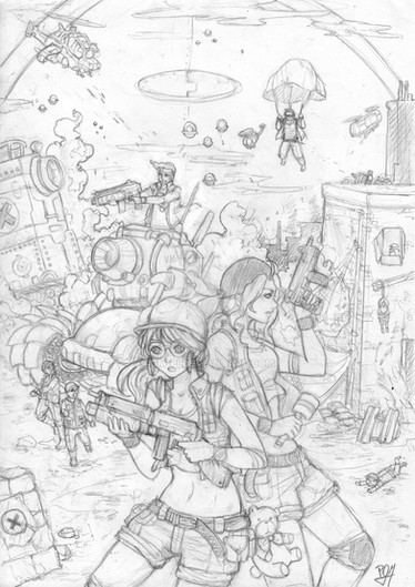 Sketchbook series. Inspired by Alan Martin's Tank Girl, it started off with a loose sketch of the girl on the far right, making it's way to a one page illustration, uncalled for.