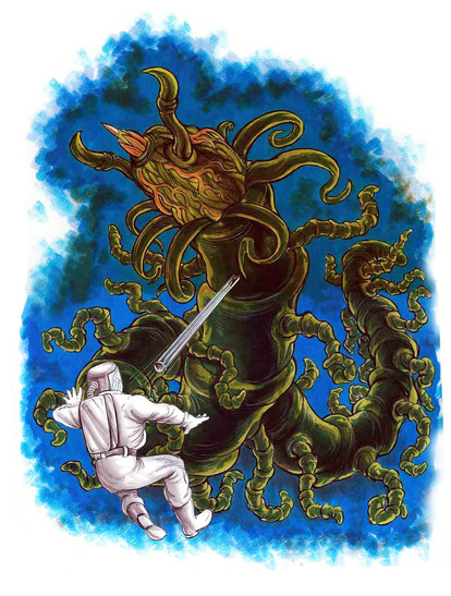 This is Chiseltooth: a gigantic man-ape with an equally gigantic maw! He can eat a human being in one gulp!Colored in Photoshop with added textures taken from photos of dirty walls (which I messed around with in Illustrator.) The creases were added using elements from creased paper I photographed.)