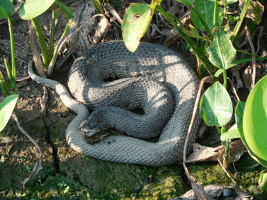 Banded water snakes are not poisonous, but will strike a painful bite if cornered. They also release a foul-smelling musk. Sadly they are frequently mistaken for the poisonous water moccasin and killed. Even worse, they are killed just because they are a snake.