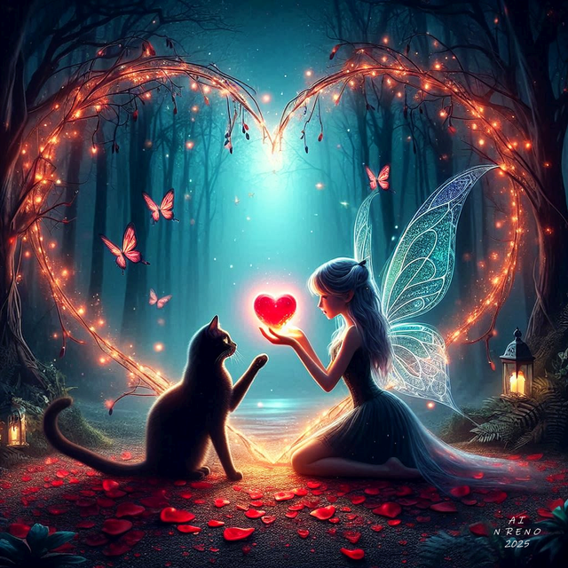 #magic #fairy #fairytale #cat #forest #fantasyart #adoptable #ai #bff #collectable #hearts #printable #wallart #aiart #dailychallenge #keptstudio #medium_res #valintine2025