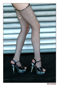 Oh, I really like this one. Perfectly sharp, makes the fishnets stand out beautifully, especially in contrast to the rougher logs behind her. Nice legs too!