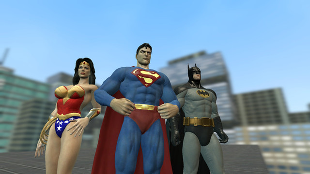 Superman, Batman and Wonder Woman, DC's Big Three, or The Trinity.Batman and Superman costumes and props are form Joequick's Golden Age set, with my own textures (including Superman's shield). Wonder Woman costume and props by Tylermcdowell.