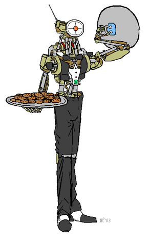 The humanoid entourage labour personal entertainment robot a.k.a. HELPER is a state of the art top notch super complex and relievable robotic assistant. Knowledgeable in hand to hand combat, fine art, music, dancing. Excellent butler, baby sitter, chef, maid and mechanic. Knows more languages than C3PO! And has a shooting British accent too. What more would you ask for?