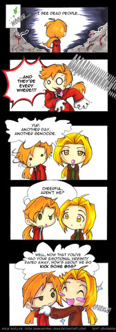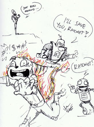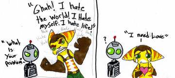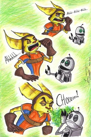 Comic idea that's been swimming in my head for a while. I really shouldn't insult Ratchet so much, but....oh! Tail puff! Puffy, puff, puff!I know the little red ball ontop of Clank's antenna isn't THAT big...but over-doing it is fun - just like....TAIL PUFF!