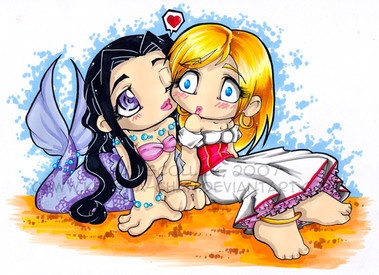 So the tacky title stayed.I return-fire at *DazedPink 's artwork for me with one of my own! Those who know us both well enough know that we love doing cross-over pics of one of our goddess/God characters interacting with one of the other's.