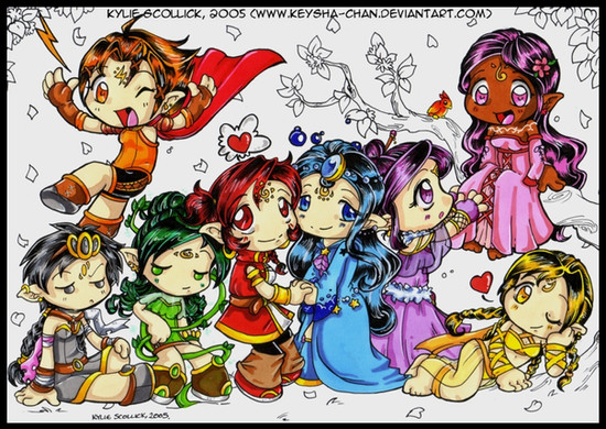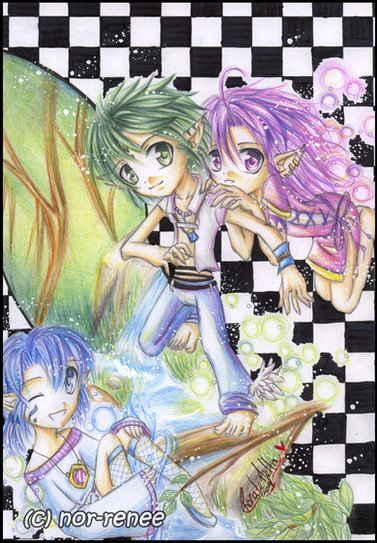 Your colouring is wonderful, as usual! Each of their hair and their outfits look so bright! And their outfits are really neat, in themselves. :3