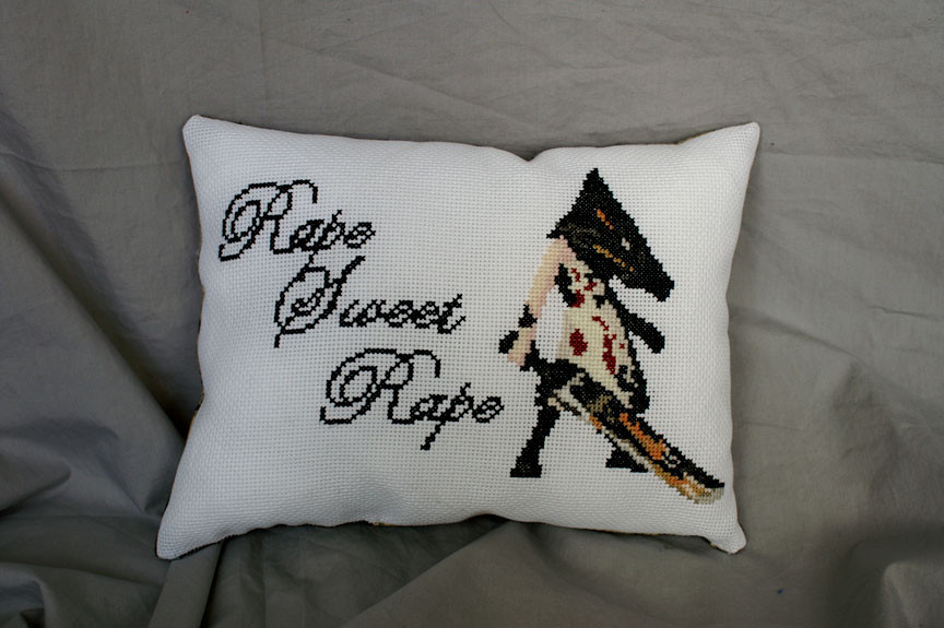 In the game "Silent Hill 2", Pyramid Head rapes his fellow monsters. Don't worry, I'm not making light of rape or rape victims. It is just a pillow and there is absolutely no malice or ill-will towards anyone. And perhaps you've added a new dimension to my work, the contrast or juxiposing comfort and something as terrible as rape. Thank you for your concern and comment.